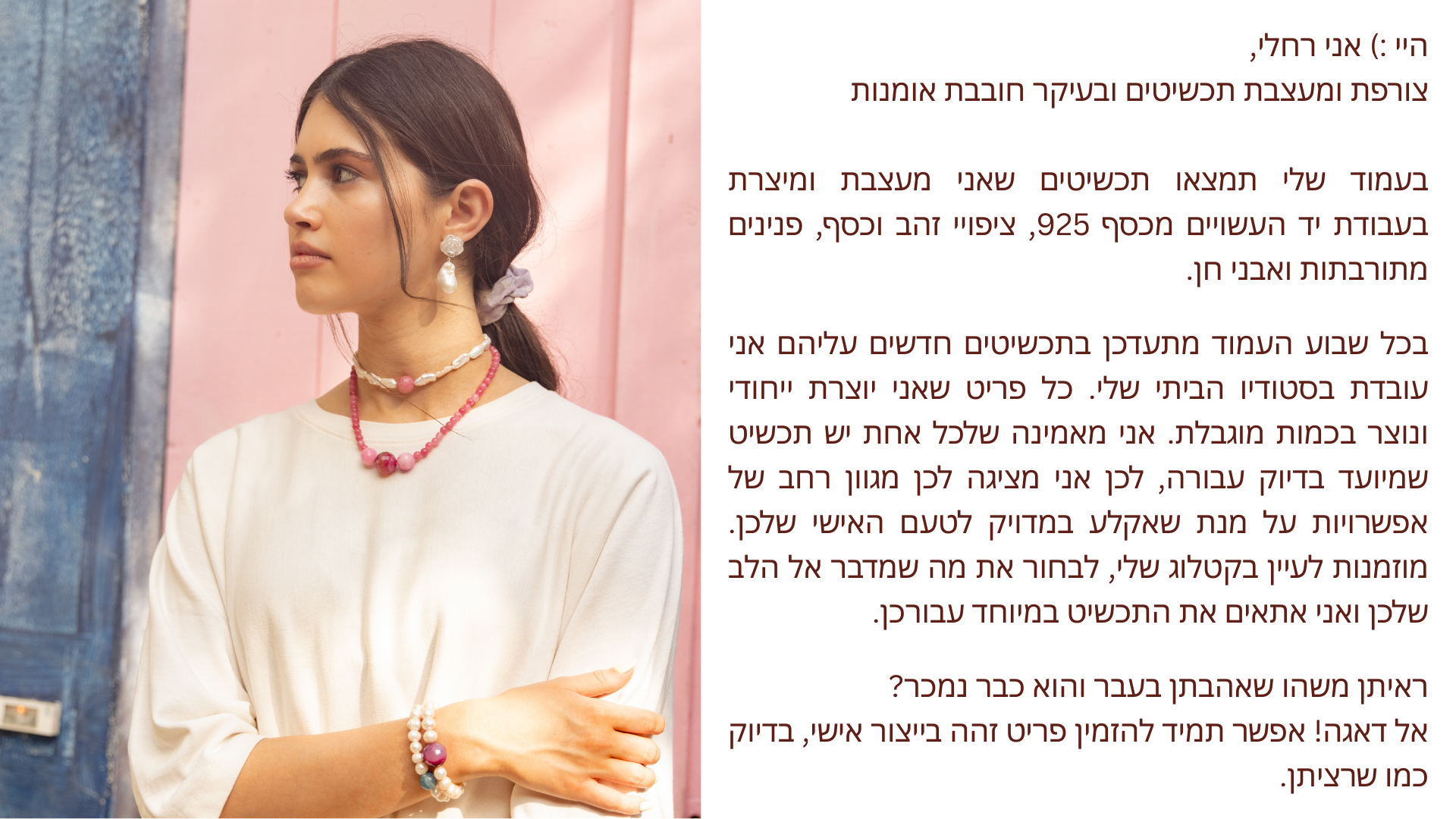 הצטרפו אליי לסדנת צורפות ייחודית, אינטימית ומלאת השראה, שבה תיצרו תכשיט אישי...