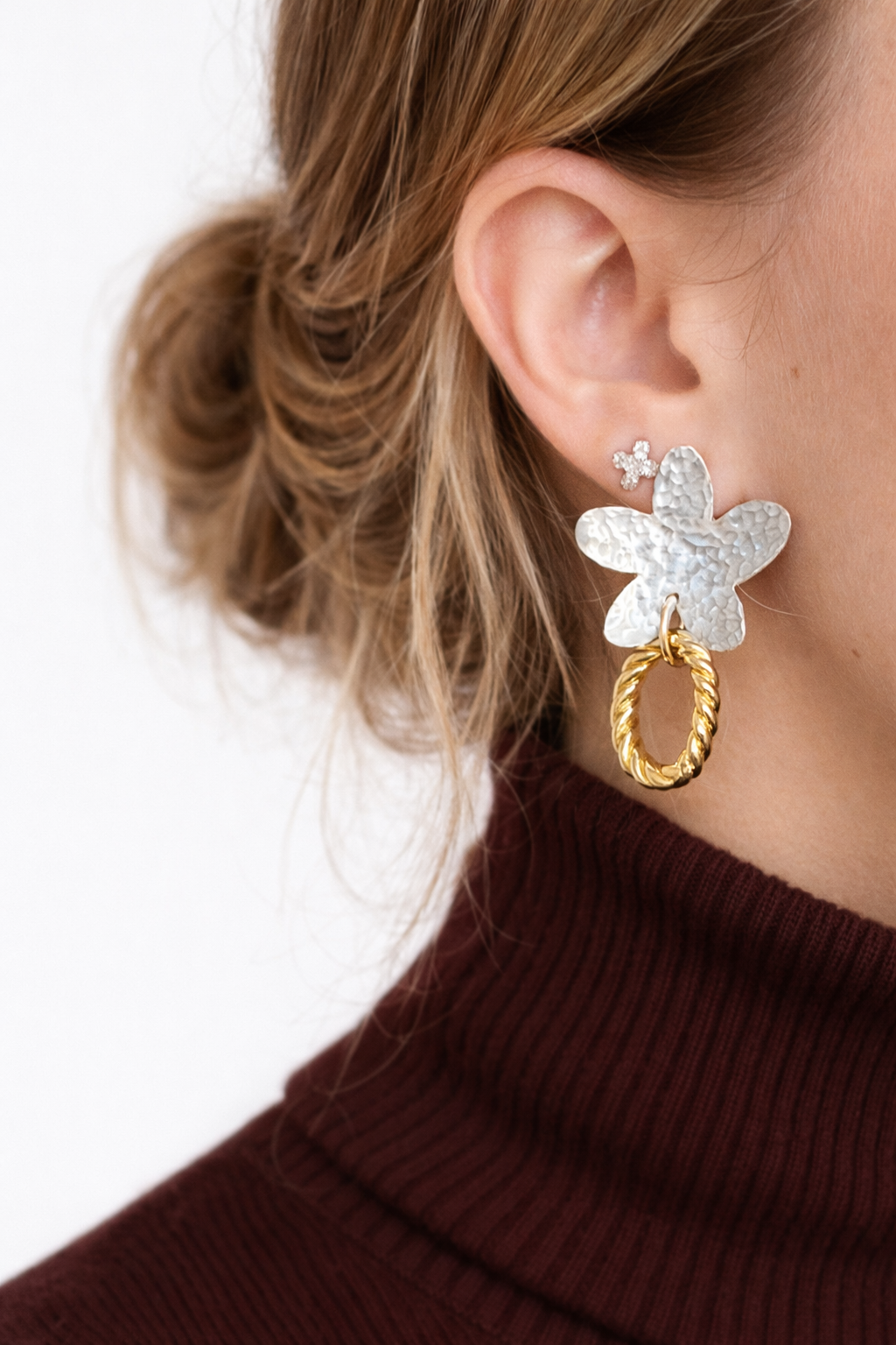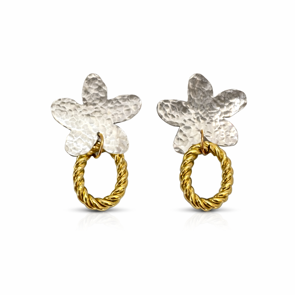 עגילים עם פרח מרוקע מכסף 925, בשילוב חוליית טוויסט אליפטית בציפוי זהב 2 מיקרון.