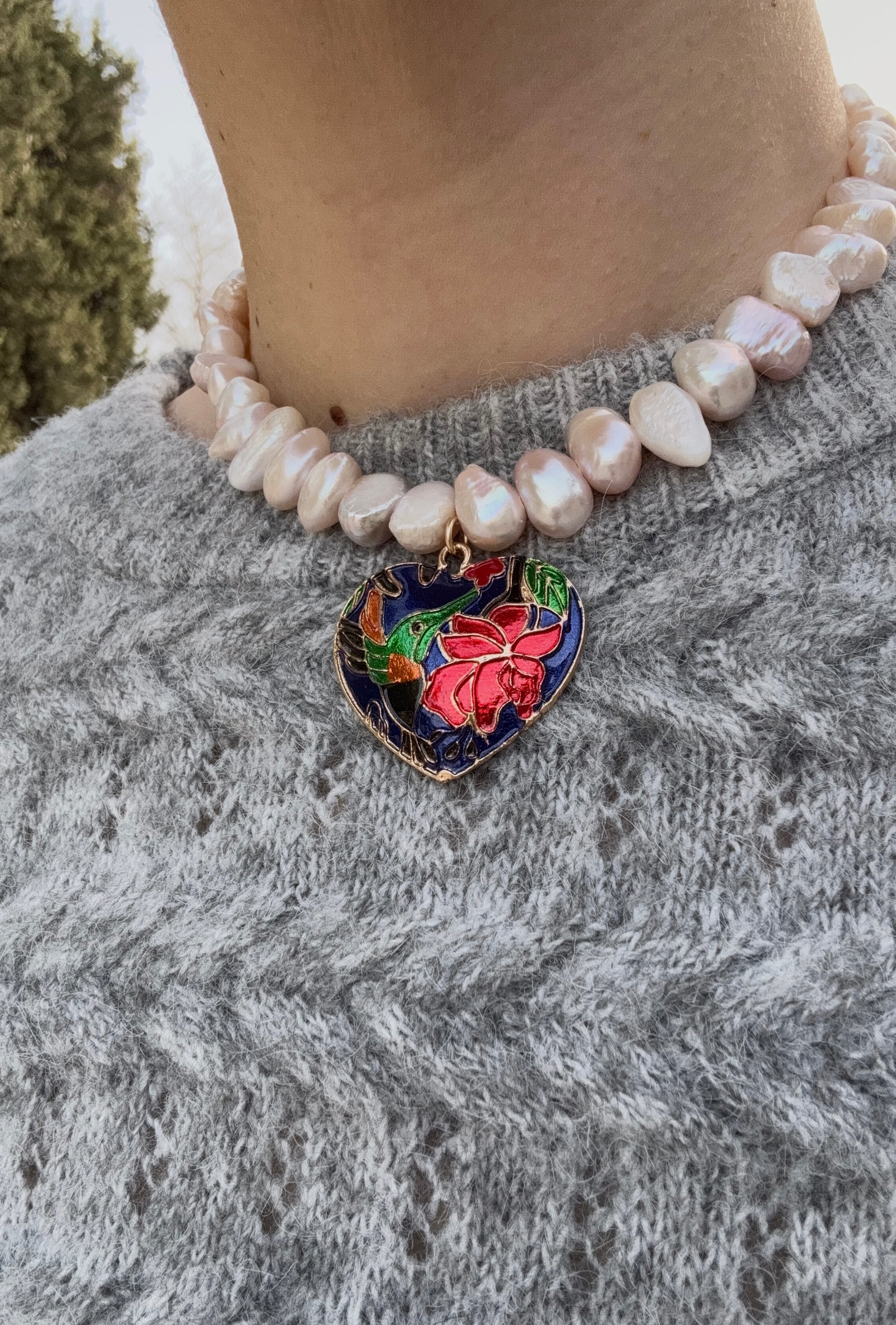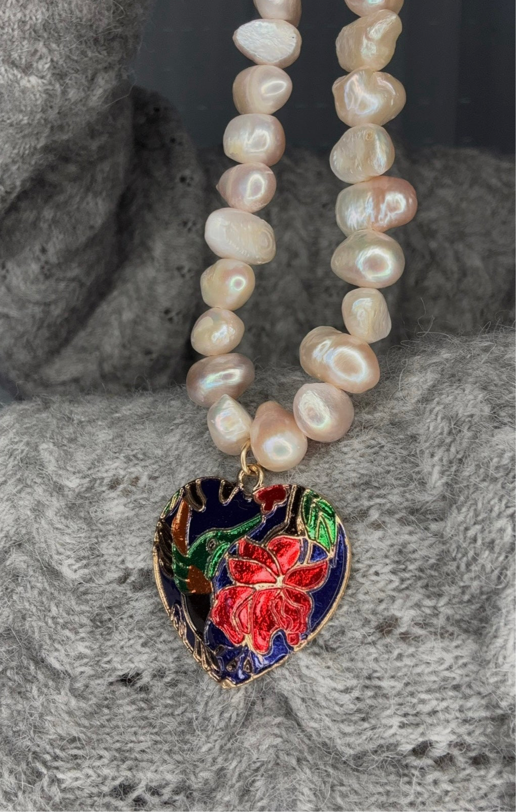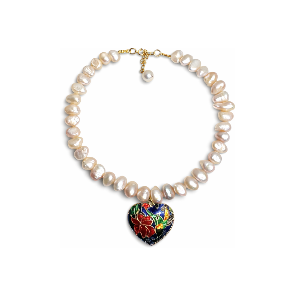 שרשרת פנינים מיוחדת מפניני מים מתוקים טבעיות בגימור לא אחיד (Baroque), עם תליון לב צבעוני במרכז שנותן טאץ’ בולט ובעל נוכחות.