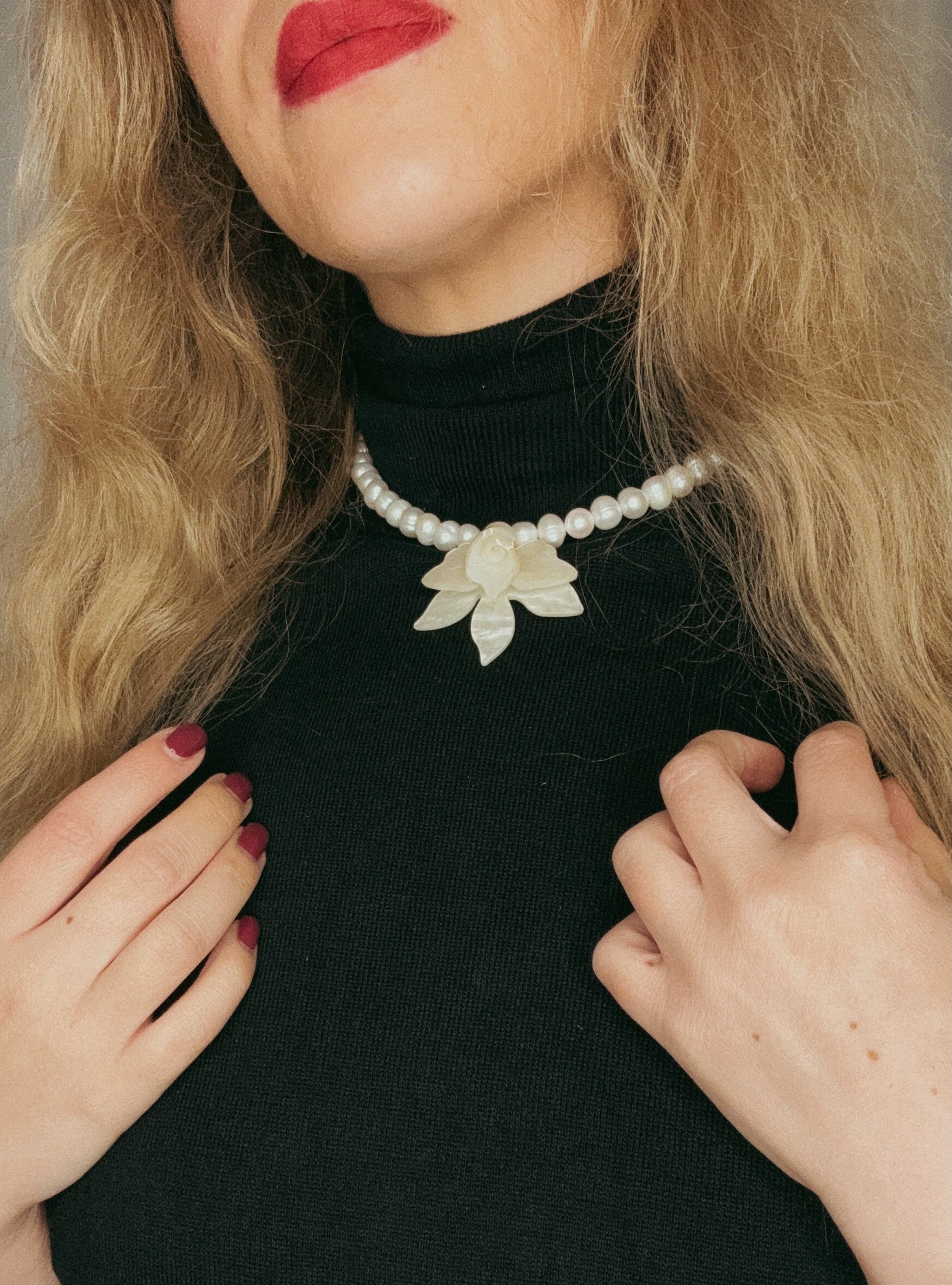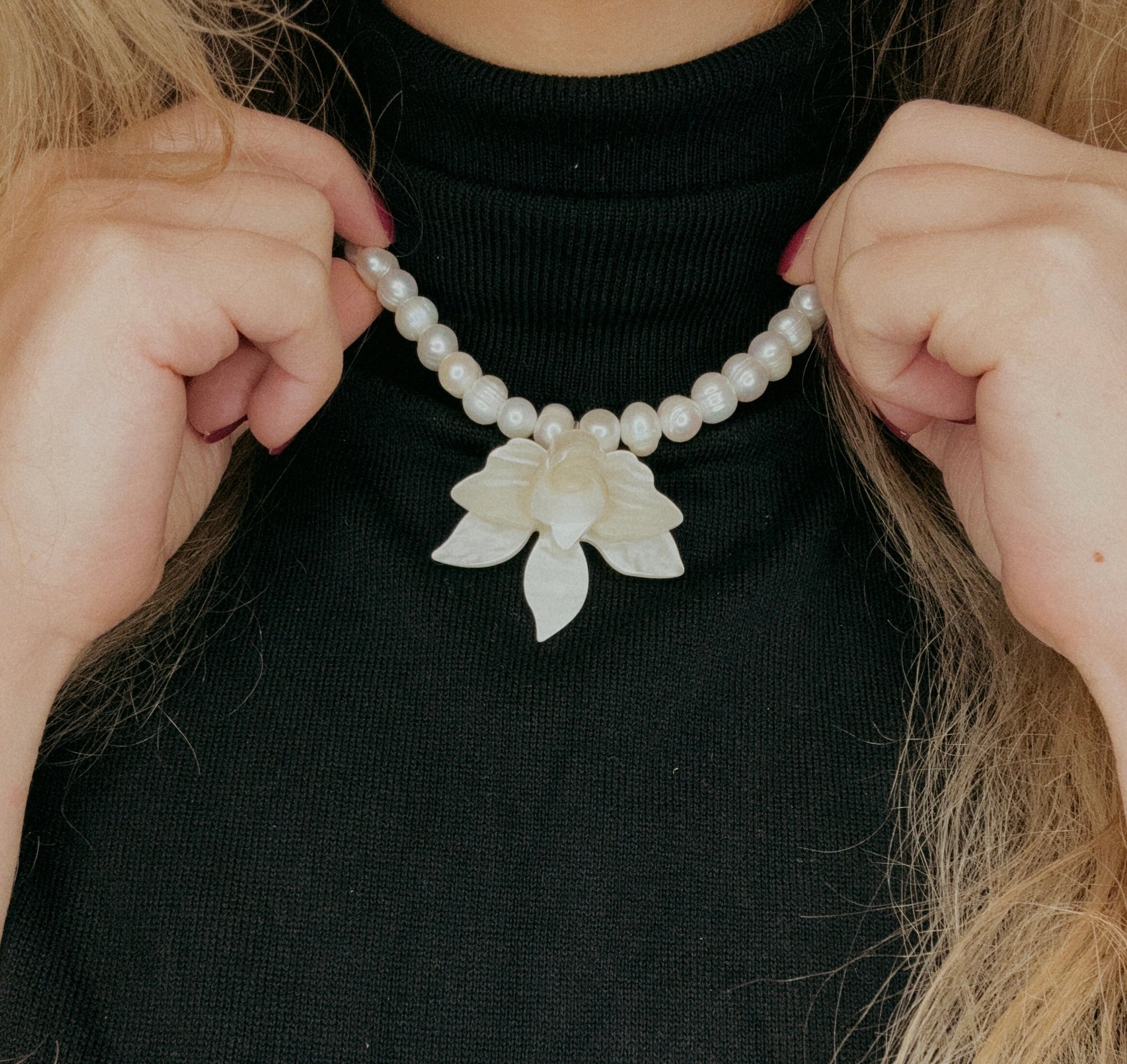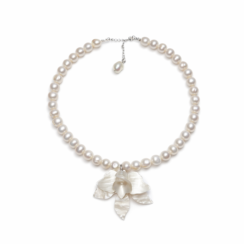 שרשרת פנינים מתורבתות בעיצוב קלאסי, עם תליון פרח נוכח עשוי אם־הפנינה
