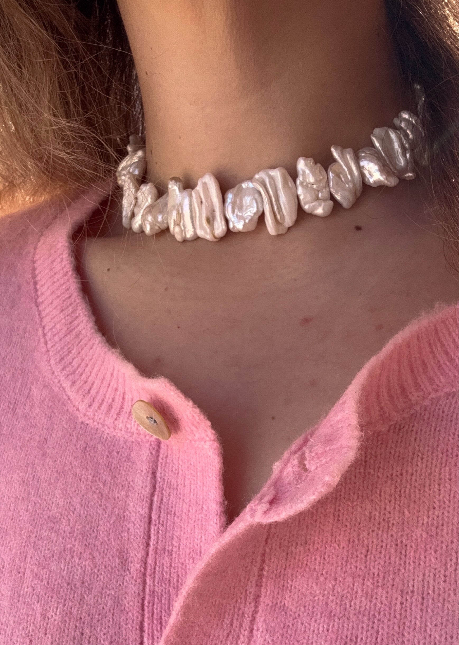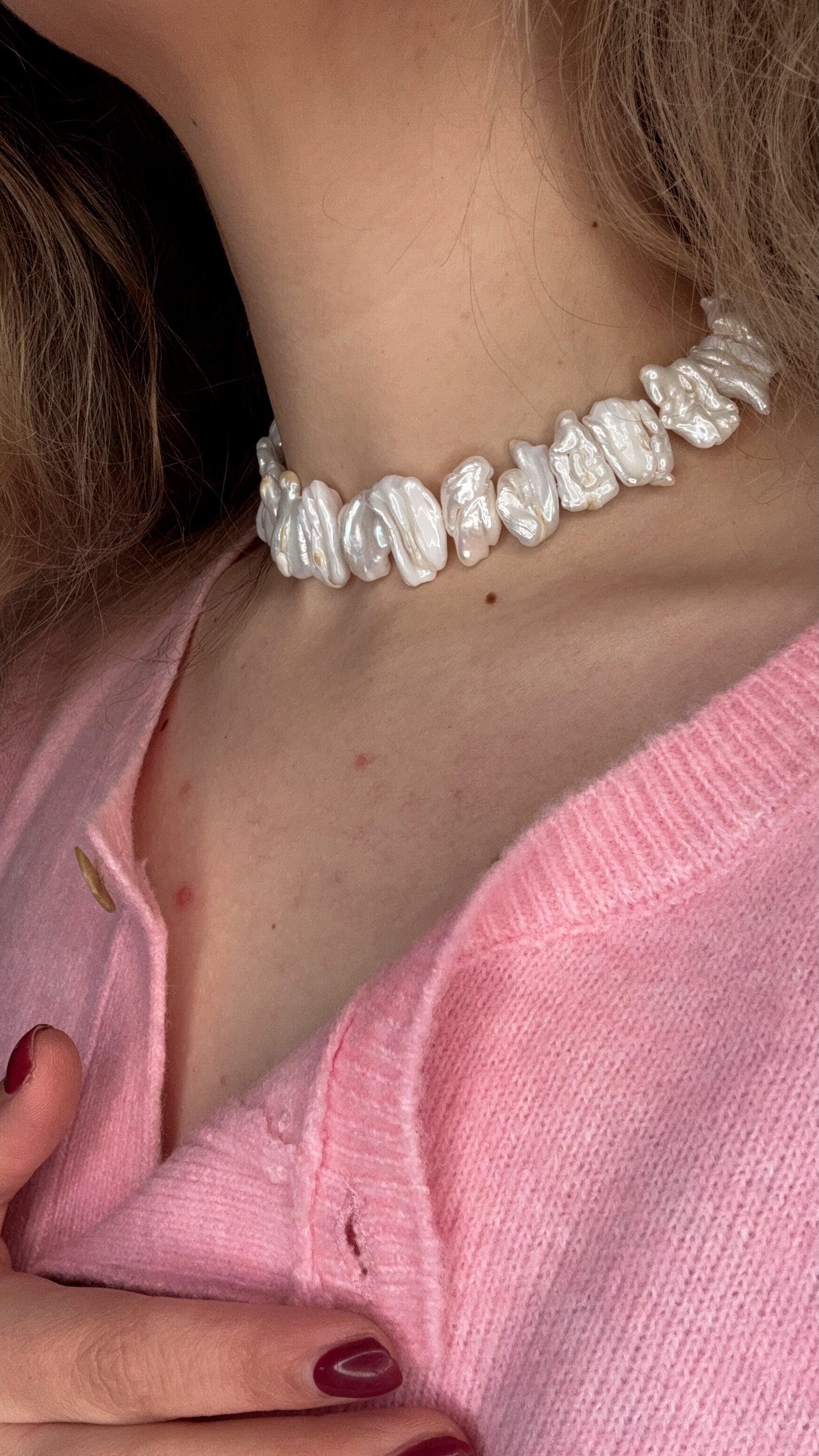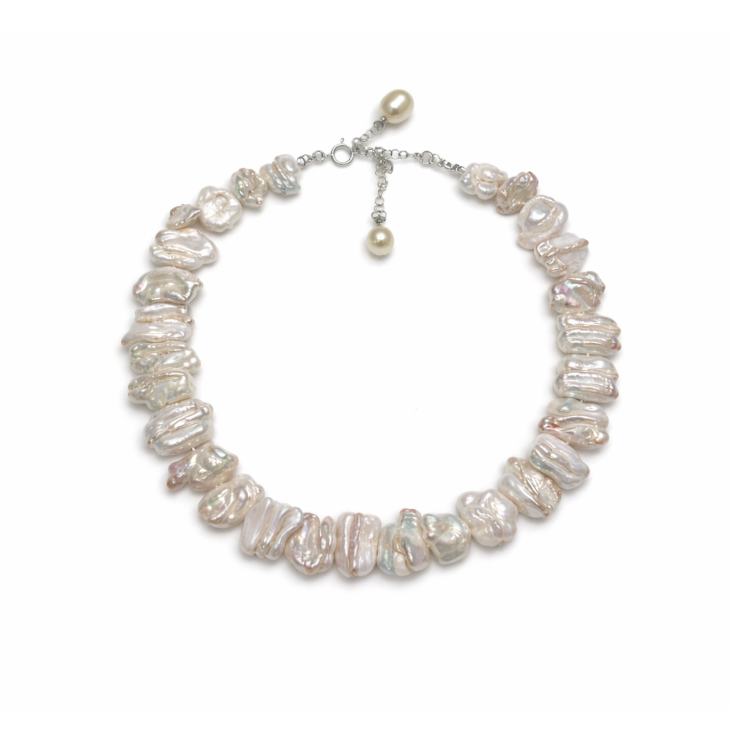 שרשרת עשויה פניני ברוק מתורבתות, כל פנינה בעלת צורה אורגנית וייחודית – אין שתיים זהות