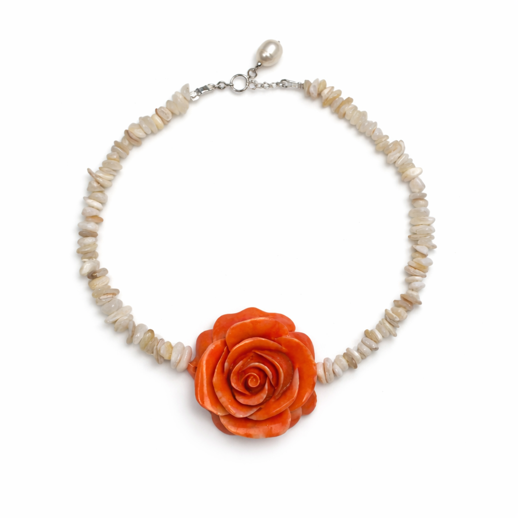 שרשרת בגוונים חמים עם פרח קורל כתום במרכז, משולבת באבני צ’יפס טבעיות